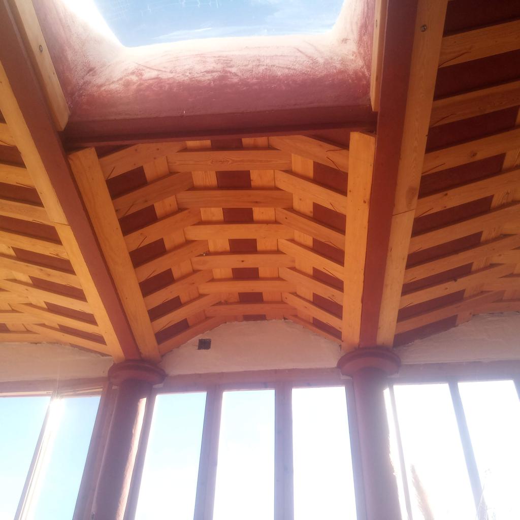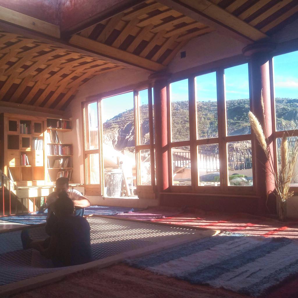 La planta superior ofrece un amplio salón para yoga, masajes, encuentros y coworking. Una biblioteca temática y la terraza con vistas a la montaña invitan a la inspiración y al descanso. Las veladas suelen terminar alrededor del fuego bajo las estrellas.