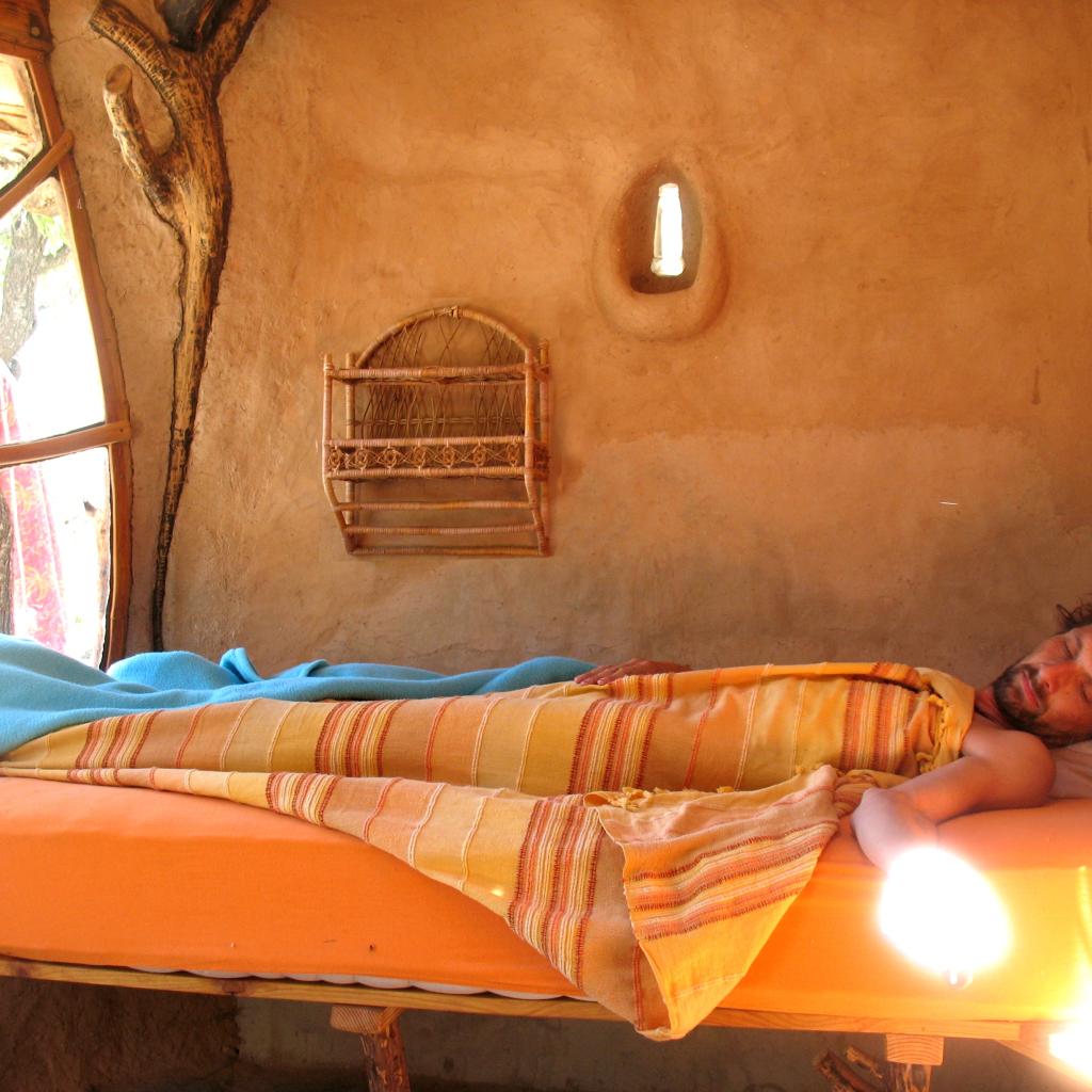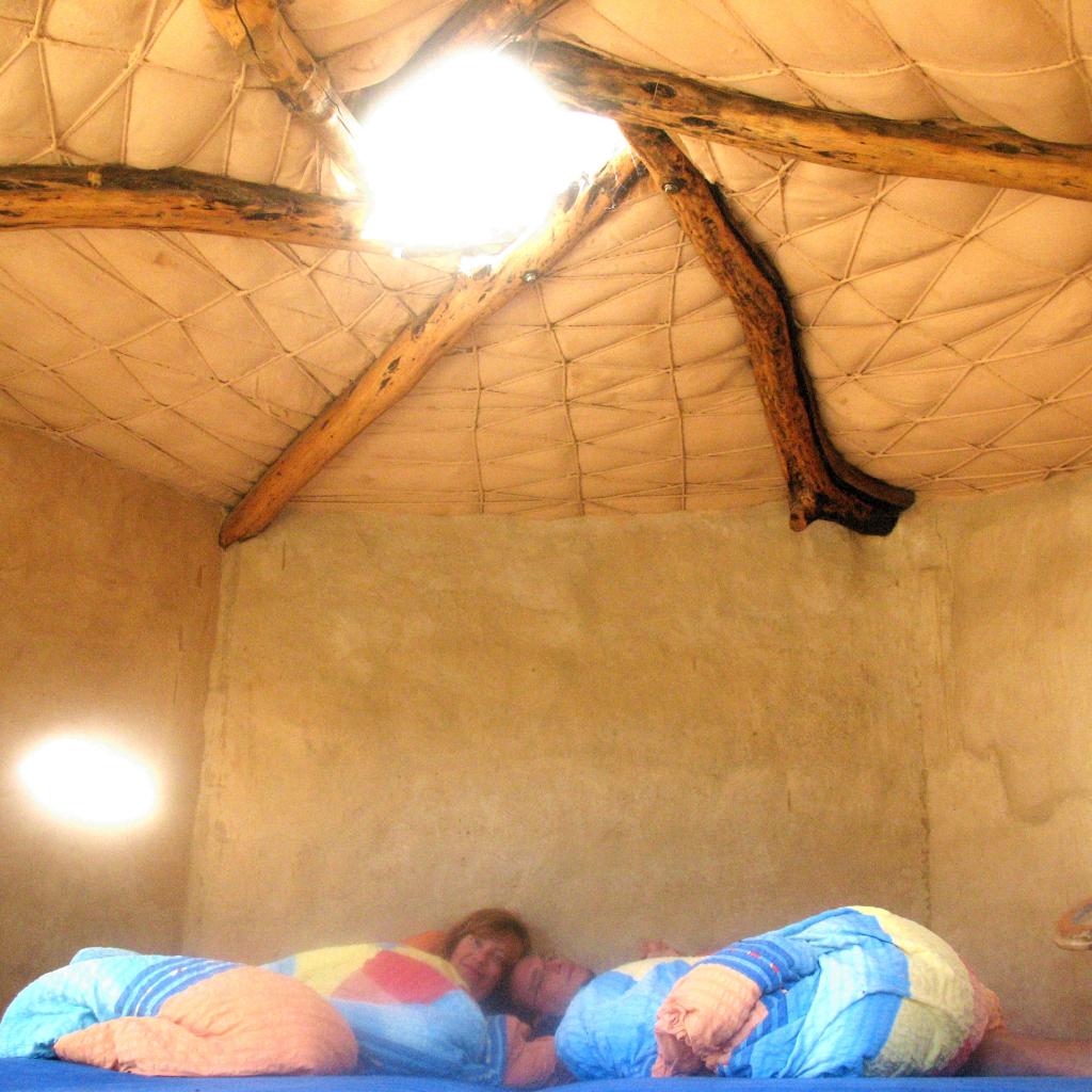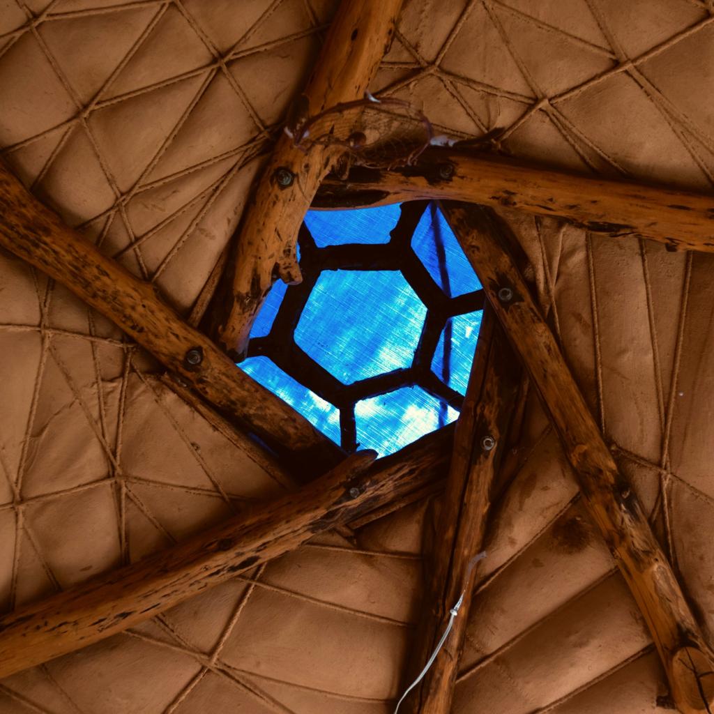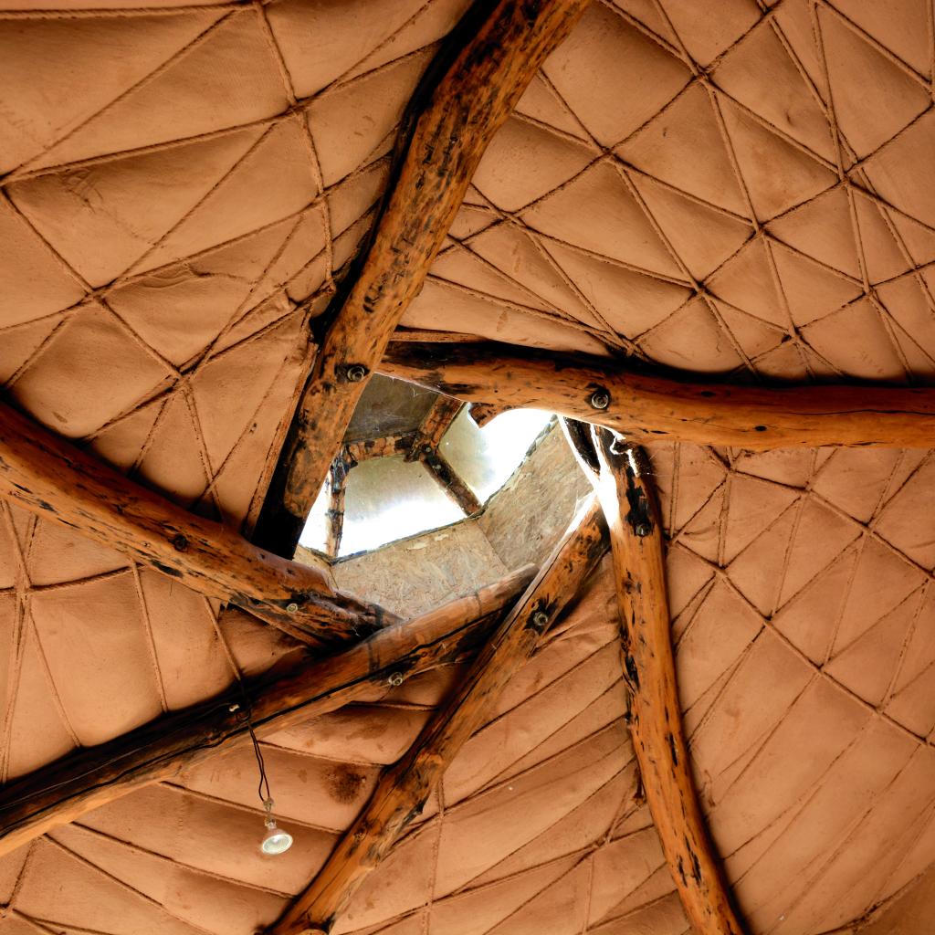 Hicimos un experimento muy especial con el techo: una soga trenzada cubierta por estopa, una capa de arcilla ligera mezclada con la parte interna de la pita (agave), juncos del río, la perlita y barro. Todo esto está cubierto con plástico y una cubierta hecha de cal, arena y pelo de cabra.